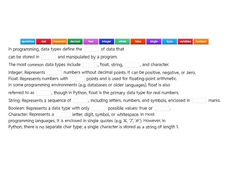 In programming, data types define the ____ of data that can be stored in ____ and manipulated by a program. The most common data types include ____, float, string, ____, and character. Integer: Represents ____ numbers without decimal points. It can be positive, negative, or zero. Float: Represents numbers with ____ points and is used for floating-point arithmetic. In some programming environments (e.g. databases or older languages), float is also referred to as ____, though in Python, float is the primary data type for real numbers. String: Represents a sequence of ____, including letters, numbers, and symbols, enclosed in ____ marks. Boolean: Represents a data type with only ____ possible values: true or ____. Character: Represents a ____ letter, digit, symbol, or whitespace. In most programming languages, it is enclosed in single quotes (e.g. 'A', '7', '#'). However, in Python, there is no separate char type; a single character is stored as a string of length 1.