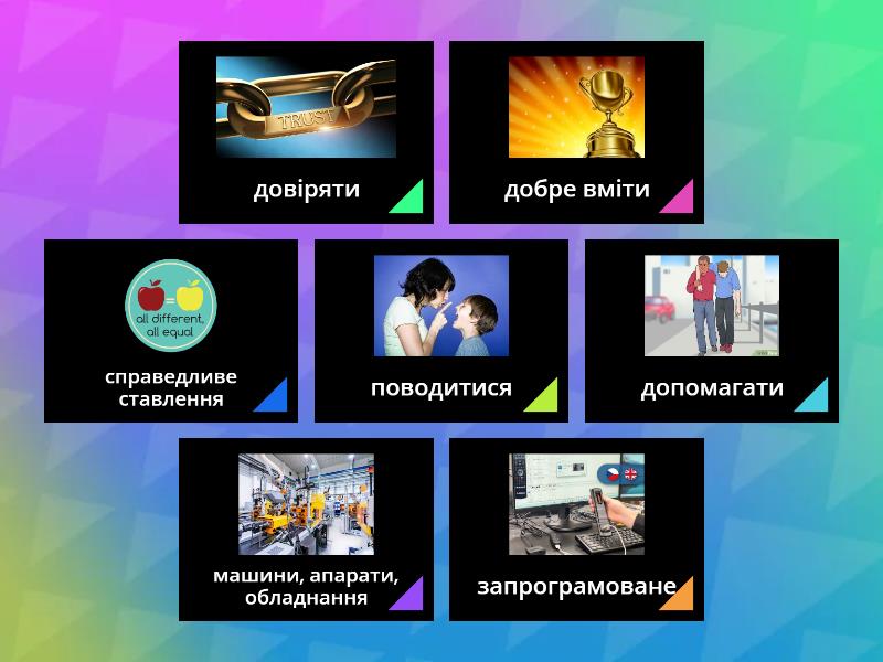 справедливе ставлення - be treated fairly, машини, апарати, обладнання - machines, поводитися - behave, допомагати - assist, довіряти - trust, запрограмоване - be programmed, добре вміти - ______ really good at ______,