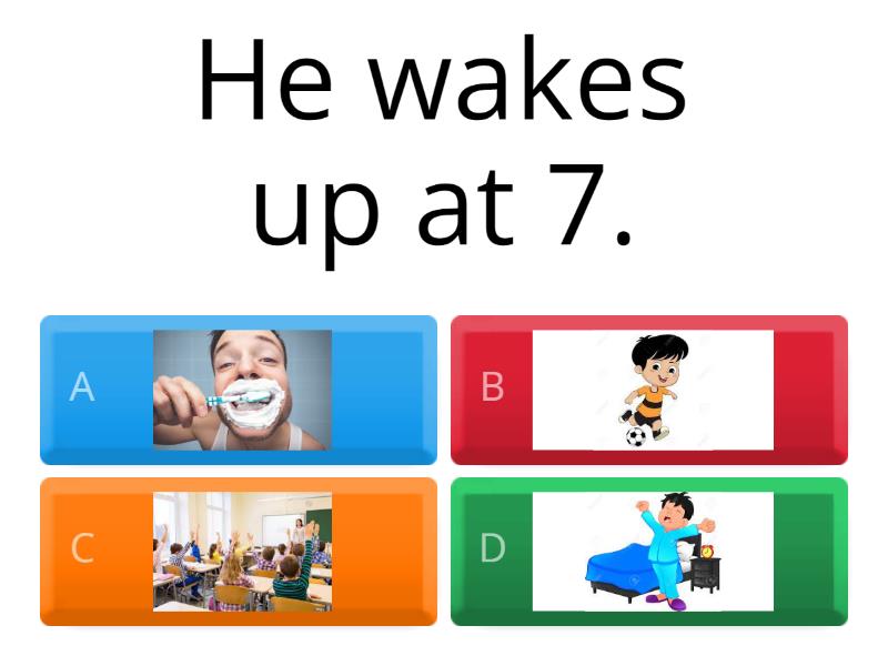 1) He wakes up at 7. a) b) c) d) 2) He brushes his teeth every morning. a) b) c) d) 3) She combs her hair. a) b) c) d) 4) They have breakfast at 7:30. a) b) c) d) 5) We go to school from Monday to Friday. a) b) c) d) 6) I play football in the afternoon. a) b) c) d) 7) She does her homework at home. a) b) c) d) 8) We eat dinner in the evening. a) b) c) d) 9) They watch TV at 8. a) b) c) d) 10) I sleep at night a) b) c) d)