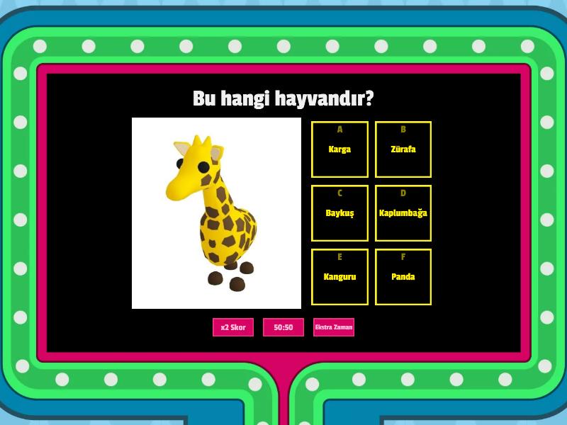 1) Bu hangi hayvandır? a) Karga b) Zürafa c) Baykuş d) Kaplumbağa e) Kanguru f) Panda 2) Bu hangi hayvandır? a) İnek b) Balık c) Kurbağa d) Ayı e) At f) Dinazor 3) Bu hangi yiyecektir? a) Altın Elma b) Elma c) Reçelli Tost d) Şeker e) Lavanta f) Balık 4) Hangisi daha değerlidir? a) Karanlık Ejderha b) Altın Unicorn c) Soğuk Ejderha d) Kanguru e) Kaplumbağa f) Lav Ejderha 5) Bu nedir? a) Şeker Fırlatıcısı b) Şemsiye c) Motor d) Araba e) Bisiklet f) Paten 6) Bu nedir? a) Baykuş b) Gökküşağı Ejderhası c) Lunar d) Eşşek e) Zebra f) Ride Posion 7) Bu hayvan kaç şekere satıldı? a) 1000 b) 100 c) 100,000 d) 10,000 e) 500 f) 3100 8) Adopt me kaç yılında kuruldu a) 2000 b) 2021 c) 2024 d) 2011 e) 2022 f) 2018 9) Ride posion kaç robuxdur? a) 200 b) 300 c) 100 d) 150 e) 450 f) 1000