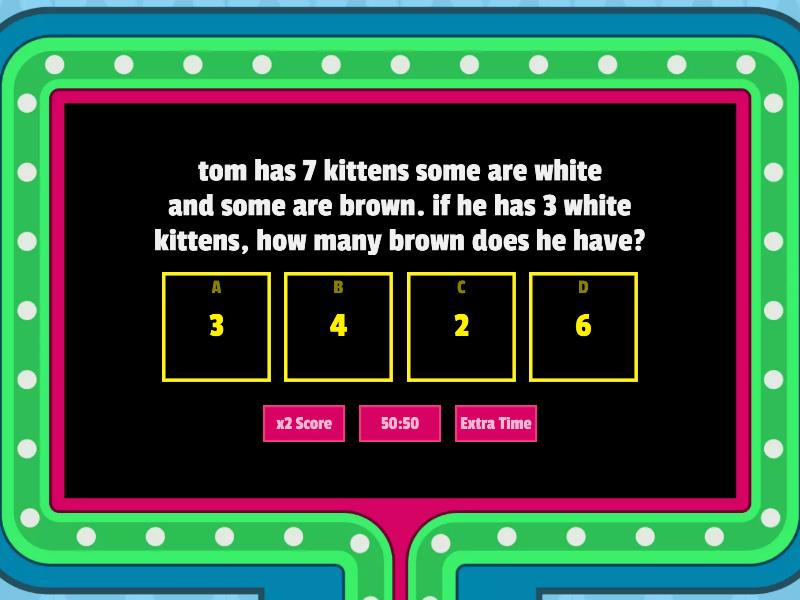 1) tom has 7 kittens some are white and some are brown. if he has 3 white kittens, how many brown does he have? a) 3 b) 4 c) 2 d) 6 2) pam loves jam she went to the market and bought 6 jars of jam 1 of them was mango jam and the rest of them were strawberry, how many strawberry jam jars did she buy? a) 5 b) 6 c) 2 d) 7 3) I went to the farm and picked 8 apples 2 of them were green and the others were red. how many red apples do i have? a) 7 b) 5 c) 6 d) 2 4) Emi invited 10 friends for her birthday . 4 of them were girls. How many boys came over to Emi's birthday? a) 9 b) 8 c) 3 d) 6 5) 7 people were swimming in the pool. 5 were adults. How many children were swimming in the pool? a) 10 b) 5 c) 2 d) 4 6) Diamond has 7 candy bears. She eats 3. How many is she going to save for later? a) 9 b) 12 c) 4 d) 5