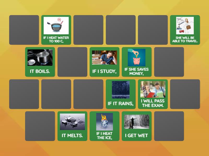 IF IT RAINS, - I GET WET, IF I STUDY, - I WILL PASS THE EXAM., IF SHE SAVES MONEY, - SHE WILL BE ABLE TO TRAVEL., IF I HEAT THE ICE, - IT MELTS., IF I HEAT WATER TO 100 C, - IT BOILS., IF I DON’T EAT NOW, - I WILL BE HUNGRY LATER., IF YOU EAT TOO MUCH, - YOU GET A STOMACHACHE., IF I DON'T DRINK WATER, - I GET THIRSTY., IF I DON'T SLEEPY, - I GET SLEEPY., IF I GET SICK, - I WILL GO TO THE DOCTOR., IF I SAVE MONEY, - I WILL BUY A CAR.,