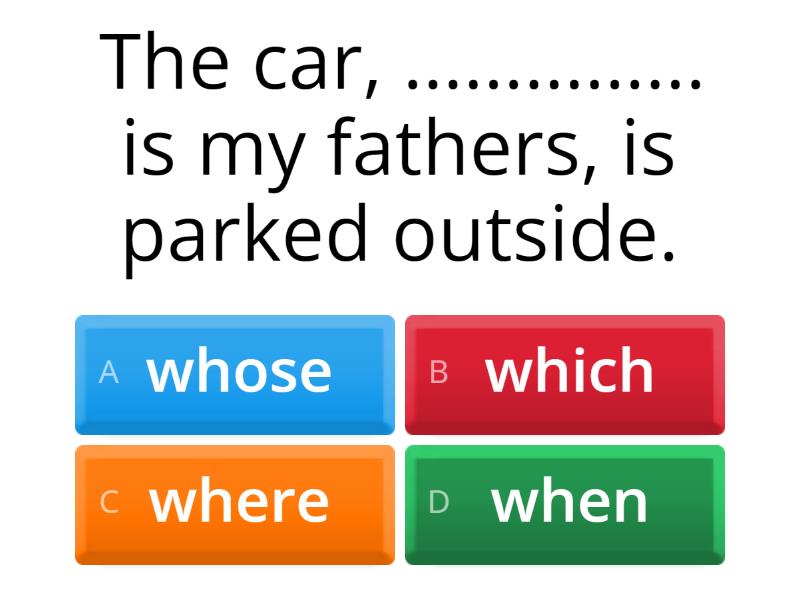 1) The car, ............... is my fathers, is parked outside. a) whose b) which c) where d) when 2) London, ............. has a population of 7 million, is an interesting city. a) which b) when c) where d) who 3) My sister, .................. is a surgeon, lives in Tokyo. a) where b) who c) whose d) which 4) Next Saturday, .............. I'm in Hanoi, it's my birthday. a) where b) whose c) when d) who 5) Bangkok, ................ I was born, is a huge city. a) when b) who c) where d) which 6) Louisa, .................... mum is a teacher, is my best friend. a) who b) whose c) which d) where 7) The shirt, ............. my friend made for me, is very comfortable. a) which b) who c) when d) where 8) Tony Teo, ................. is from South Africa, is our substitute teacher. a) where b) whose c) who d) which 9) In February, ................ it's Tet holiday, there is less traffic in HCMC. a) when b) where c) which d) whose 10) The cafe, ................. my Aunt works, has delicious cakes.  a) which b) who c) when d) where