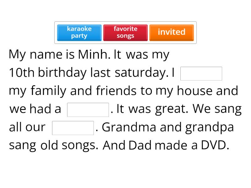 My name is Minh. It was my 10th birthday last saturday. I ____ my family and friends to my house and we had a ____. It was great. We sang all our ____. Grandma and grandpa sang old songs. And Dad made a DVD. I'm Quang. Last sunday, I had a ____ at a restaurant near my house. We ate pizza but my mom said we could have ____ too. Because it was my birthday. My mom ____. This morning, I ____ to my friends to say thank you for comming to my party. Hi, I'm Lam. On May 8th, I had a ____ at Damsen park. There were ____.