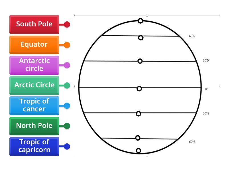 Tropic of cancer, South Pole, Equator, North Pole, Antarctic circle, Tropic of capricorn, Arctic Circle.