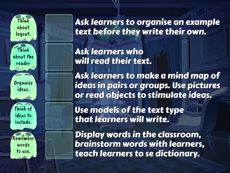 Think about the reader - Ask learners who will read their text., Think of ideas to include. - Ask learners to make a mind map of ideas in pairs or groups. Use pictures or read objects to stimulate ideas., Remember words to use. - Display words in the classroom, brainstorm words with learners, teach learners to se dictionary., Organise ideas. - Ask learners to organise an example text before they write their own., Think about layout. - Use models of the text type that learners will write.,