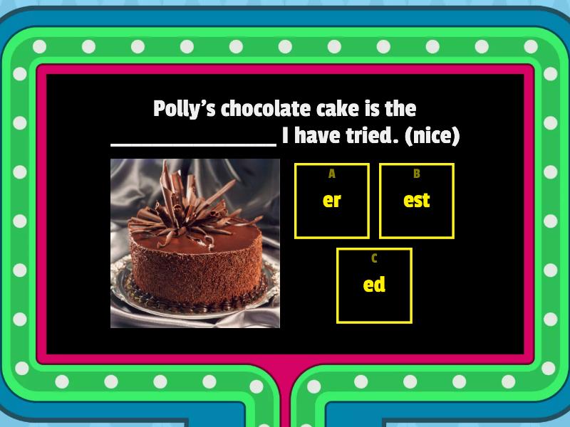 1) Polly's chocolate cake is the ________________ I have tried. (nice) a) er b) est c) ed 2) I'm going to my Grandma's house __________________. (late) a) er b) est c) ed 3) Mrs Smith _______________ a cake for her friend's birthday. (bake) a) er b) ed c) est 4) He's the best ________________ I've ever seen. (dance) a) ed b) est c) er 5) My guinea pigs are the _______________. (cute) a) est b) er c) ed 6) He ______________ a lot about his pet snake. (care) a) er b) est c) ed
