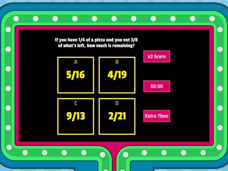 1) If you have 1/4 of a pizza and you eat 3/8 of what's left, how much is remaining? a) 5/16 b) 4/19 c) 9/13 d) 2/21 2) Sarah had 2/3 of a gallon of milk. She used 1/6 of it to make pancakes. How much milk does she have left? a) 1/2 gallon b) 1/4 gallon c) 1/3 gallon d) 1/12 gallon 3) A recipe calls for 3/4 cup of sugar, but you only have 1/2 cup. How much more sugar do you need? a) 1/2 cups of sugar  b) 1/14 cups of sugar c) 1/3 cups of sugar d) 1/4 cups of sugar  4) If you walk 1/3 of a mile to the store and then walk back, how many miles have you walked in total? a) 1/4 miles walked b) 2/3 miles walked c) 100/15 miles walked d) 99/15 miles walked 5) 5/6 + 2/3 = a) 13/100 b) 14/81 c) 17/6 d) 19/3 6) 3/4 - 1/2 = a) 1/19 b) 1/4 c) 1/32 d) 1/100 7) 7/8 + 1/4 = a) 9/8 b) 9/21 c) 12/32 d) 100/3 8) 4/5 - 1/10 = a) 7/10 b) 200/11 c) 15/20 d) 19/20 9) 2/3 + 3/5 = a) 25/20 b) 9/16 c) 20/12 d) 19/5
