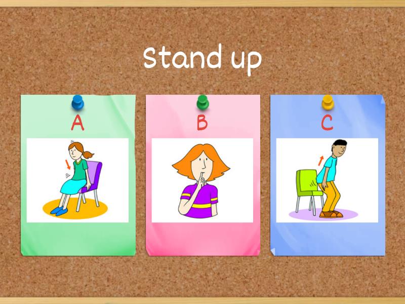 1) Stand up a) b) c) 2) Silence - Be quiet a) b) c) 3) Sit down a) b) c) 4) Open your book a) b) c) 5) Close your book a) b) c) 6) Raise your hand a) b) c) 7) Can i go to the toilet? a) b) c) 8) Listen a) b) c) 9) Write a) b) c) 10) Read a) b) c)