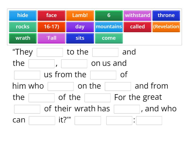 “They ____ to the ____ and the ____, ____ on us and ____ us from the ____ of him who ____ on the ____ and from the ____ of the ____ For the great ____ of their wrath has ____, and who can ____ it?’” ____ ____:____