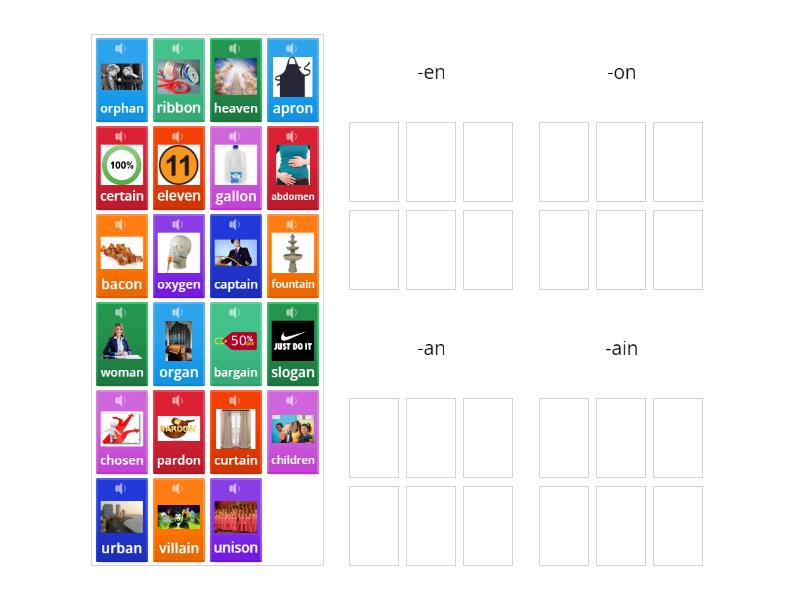 -en: eleven, oxygen, heaven, chosen, abdomen, children, -on: unison, gallon, ribbon, apron, bacon, pardon, -an: woman, organ, orphan, slogan, urban, -ain: captain, bargain, fountain, curtain, certain, villain,
