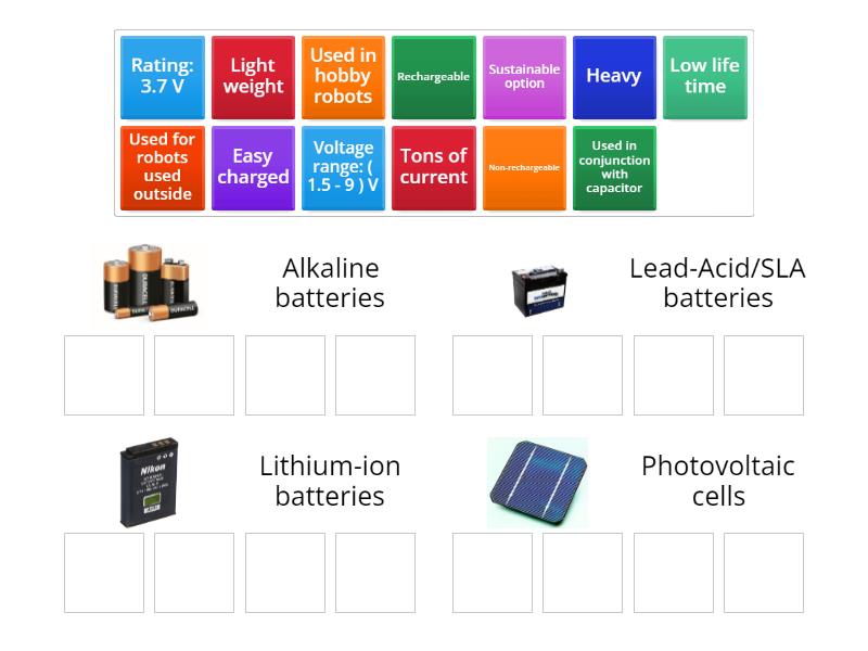 Alkaline batteries: Non-rechargeable , Voltage range: ( 1.5 - 9 ) V, Low life time, Used in hobby robots, Lead-Acid/SLA batteries: Easy charged, Tons of current, Heavy, Lithium-ion batteries: Rating: 3.7 V, Light weight, Rechargeable , Photovoltaic cells: Sustainable option, Used in conjunction with capacitor, Used for robots used outside,