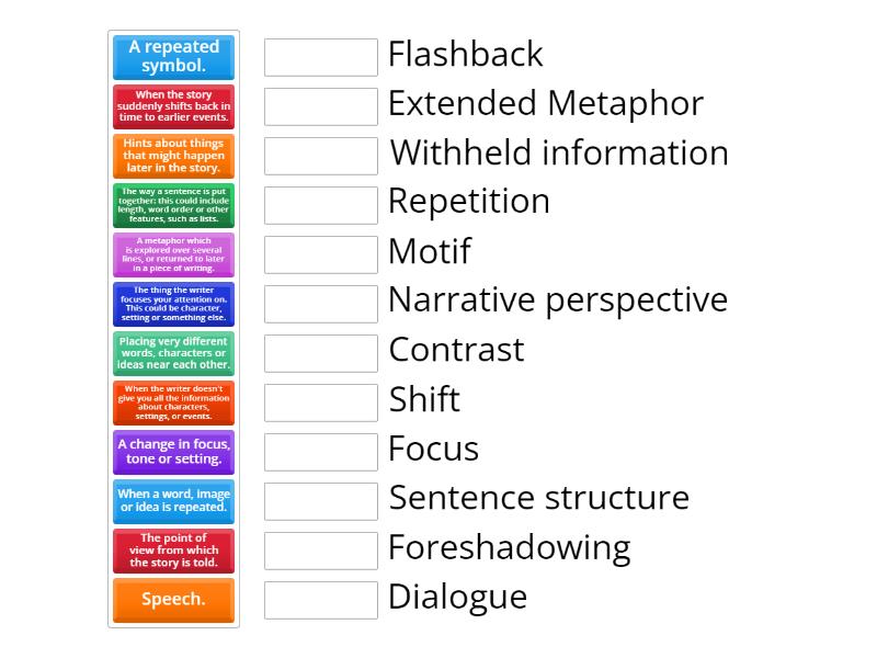The thing the writer focuses your attention on. This could be character, setting or something else. - Focus, A change in focus, tone or setting. - Shift, When a word, image or idea is repeated. - Repetition, When the story suddenly shifts back in time to earlier events. - Flashback, The point of view from which the story is told. - Narrative perspective, A repeated symbol. - Motif, The way a sentence is put together: this could include length, word order or other features, such as lists. - Sentence structure, Hints about things that might happen later in the story. - Foreshadowing, Speech. - Dialogue, When the writer doesn’t give you all the information about characters, settings, or events. - Withheld information, A metaphor which is explored over several lines, or returned to later in a piece of writing. - Extended Metaphor, Placing very different words, characters or ideas near each other. - Contrast,