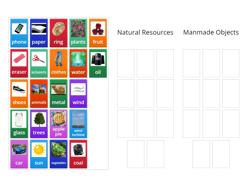 Natural Resources: water, trees, sun, oil, animals, fruit, metal, plants, coal, vegetables, wind, Manmade Objects: phone, eraser, shoes, paper, clothes, ring, scissors, glass, car, apple pie, wind turbine,