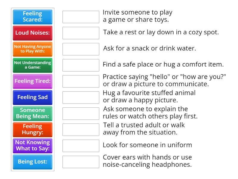 Feeling Tired: - Take a rest or lay down in a cozy spot., Someone Being Mean: - Tell a trusted adult or walk away from the situation., Not Understanding a Game: - Ask someone to explain the rules or watch others play first., Being Lost: - Look for someone in uniform, Loud Noises: - Cover ears with hands or use noise-canceling headphones., Feeling Hungry: - Ask for a snack or drink water., Feeling Sad - Hug a favourite stuffed animal or draw a happy picture., Not Having Anyone to Play With:  - Invite someone to play a game or share toys., Feeling Scared: - Find a safe place or hug a comfort item., Not Knowing What to Say: - Practice saying "hello" or "how are you?" or draw a picture to communicate.,