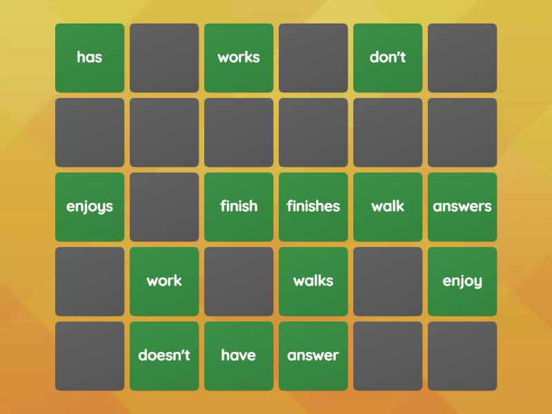 enjoy - enjoys, don't - doesn't, walk - walks, have - has, answer - answers, work - works, finish - finishes, go - goes, do - does, make - makes, help - helps, watch - watches, look - looks, drive - drives, check - checks,