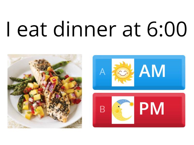 1) I eat dinner at 6:00 a) AM b) PM 2) I go to bed at 9:00 a) AM b) PM 3) I brush my teeth at 8:30 in the morning. a) PM b) AM 4) I get dressed at 7:30 a) AM b) PM 5) I wake up at 7:00 a) AM b) PM 6) I eat lunch at 12:00 a) AM b) PM 7) At midnight, it is 12:00 a) AM b) PM 8) We have English class at 1:30 a) AM b) PM 9) We watch TV after school at 4:30 a) AM b) PM 10) I have soccer early at 8:00 a) AM b) PM