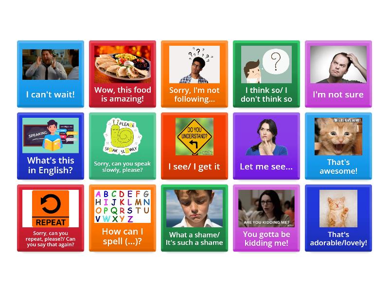 You gotta be kidding me! - Você só pode estar brincando!, That's adorable/lovely! - Que lindo!, What a shame/ It's such a shame - Que pena!, That's awesome! - Isso é incrível!, I can't wait! - Mal posso esperar!, Wow, this food is amazing! - Wow, essa comida está incrível!, I think so/ I don't think so - Eu acho que sim/ Eu acho que não, Let me see... - Deixa eu ver/pensar..., I'm not sure - Não tenho certeza, I see/ I get it - Entendi, Sorry, can you speak slowly, please? - Desculpa, você pode falar mais devagar, por favor?, Sorry, can you repeat, please?/ Can you say that again? - Desculpa, você pode repetir, por favor?, What's this in English? - O que é isso em inglês?, Sorry, I'm not following... - Desculpa, não estou entendendo..., How can I spell (...)? - Como soletro (...)?,