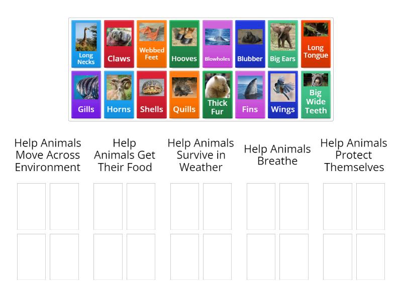 Help Animals Move Across Environment: Webbed Feet, Hooves, Wings, Fins, Help Animals Get Their Food: Big Wide Teeth, Long Tongue, Long Necks, Help Animals Survive in Weather: Thick Fur, Big Ears, Blubber, Help Animals Breathe: Blowholes, Gills, Help Animals Protect Themselves: Horns, Claws, Quills, Shells,