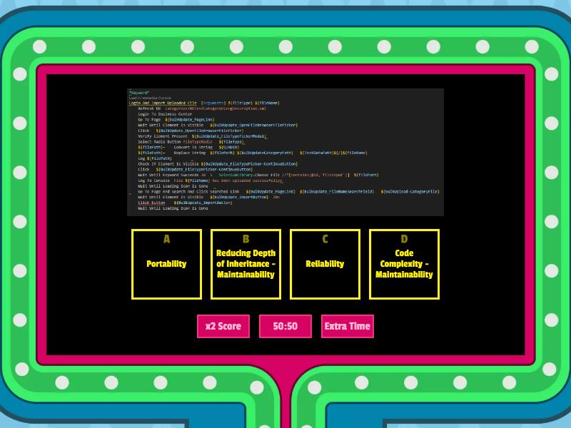 1) A 100% Passing Rate for 3 Consecutive Executions a) Portability b) Functional Suitability c) Reliability d) Code Complexity - Maintainability 2) Validating Test Cases vs. User Story a) Functional Suitability b) Reducing Depth of Inheritance - Maintainability c) Portability d) Portability 3) Single Test Data Setup a) Portability b) Code Complexity - Maintainability c) Reliability d) Effectiveness and Efficiency - Maintainability 4) Defect was detected thru test case execution a) Portability b) Reliability c) Effectiveness and Efficiency - Maintainability d) Reliability 5) Test Case has Pre-conditions a) Portability b) Maintainability c) Functional Suitability d) Reducing Depth of Inheritance - Maintainability 6) Single Test Script for all environments a) Reliability b) Portability c) Effectiveness and Efficiency - Maintainability d) Functional Suitability 7) Automated Test Cases are consistently failing a) Functional Suitability b) Reliability c) Effectiveness and Efficiency - Maintainability d) Portability 8) Robocop - Static Code Quality Scan a) Maintainability b) Functional Suitability c) Portability d) Reducing Depth of Inheritance - Maintainability 9) Testing the Automated Test Cases before merging to Master (Merge Request Pipeline Testing) a) Reliability b) Code Complexity - Maintainability c) Functional Suitability d) Portability