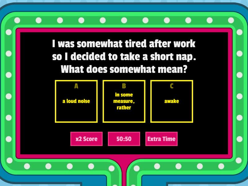 1) I was somewhat tired after work so I decided to take a short nap. What does somewhat mean? a) a loud noise b) in some measure, rather c) awake 2) His careless attitude towards studying explains his poor grades. What does attitude mean? a) to work hard at something b) hot or cold c) a way of feeling or thinking about something 3) One of the goals of the United Nations is to maintain international peace and security. What does maintain mean? a) to tear down b) to continue; keep in existence c) to hold 4) The driver decreased her speed as she approached the curve. What does decreased mean? a) speed up b) the amount by which something becomes less c) you stop doing something 5) The green lizard was camouflaged in the bush making it really hard for us to see him. What does camouflaged mean? a) to sit extremely still b) to sell something c) to hide by color so to look like its surroundings 6) The little boy could not afford a new toy so he saved his money and was able to buy it. What does afford mean? a) able to pay b) hide from c) make fun of 7) It’s the lifeguard’s duty to watch the children swim and stay safe in the pool. What does duty mean? a) a raft or something to float on b) a particular job one must do c) to hurt someone 8) I appreciate your individualism, but sometimes you need to learn to work as part of a team. What does individualism mean? a) referring to one person b) to be selfish c) to be selfless 9) I will assist my science teacher with the experiment because she needs someone to help hold the tube. What does assist mean? a) to cause harm b) to give help or support c) to laugh at 10) I had to use division to find the solution to my math problems. What does solution mean? a) an answer to a problem b) a subject in school c) a new pair on clothes for school