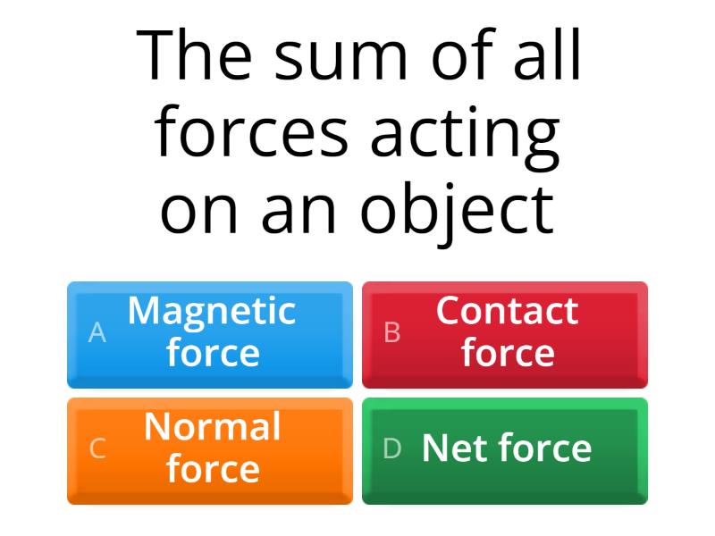 1) The sum of all forces acting on an object a) Magnetic force b) Contact force c) Normal force d) Net force 2) Forces acting on an object that combine and form a net force of zero a) unbalanced forces b) contact force c) balanced forces d) magnetic force 3) Which direction will the object accelerate? a) Up b) Down c) Right d) Left 4) Which direction will the object accelerate? a) Right b) Left c) Up d) Down 5) Which of the following shows which direction the object will accelerate in this picture? a) 40N right b) 50N left c) 90N right d) 40N left 6) Which direction will the rope accelerate in this picture? a) 20N right b) 20N up c) It's balanced d) 20N left 7) Which direction will the box accelerate in this picture? a) It's balanced b) 50N right c) 50N left d) 100N