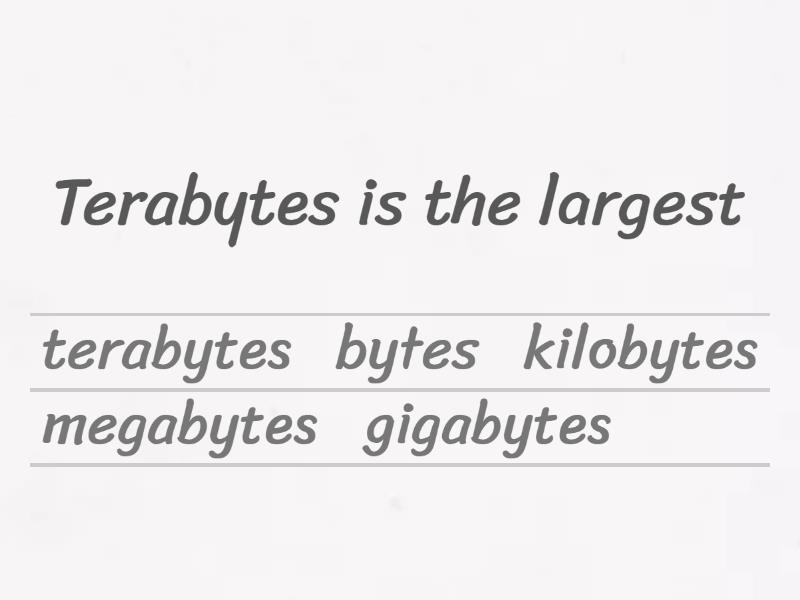 bytes kilobytes megabytes gigabytes terabytes - Terabytes is the largest, B KB MB GB TB - B stands for bytes, bit nybble byte - A nybble is 4 bits, letter document image movie - A single letter is one byte,