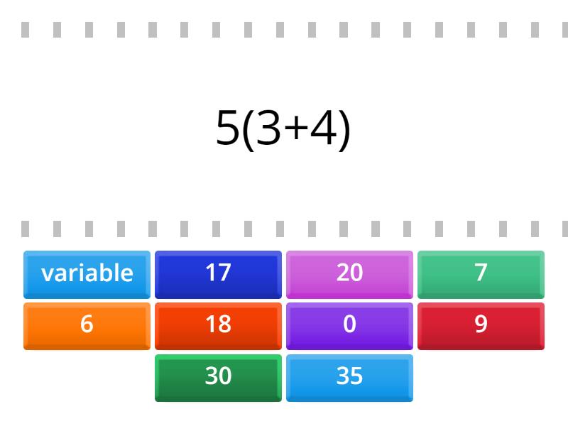 35 - 5(3+4), 9 - 24➗6+5, 6 - 24➗(8 - 4), 30 - (10+5)✖2, 20 - 10+5✖2, 17 - (8-3)✖3+2, 7 - 4-2+9-4, 18 - 12+2(4-1), 0 - (4+3) - (2+5), variable - A letter used in place of an unknown value,