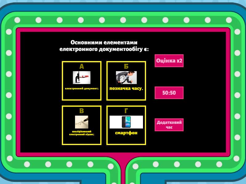 1) Основними елементами електронного документообігу є: a) електронний документ; b) позначка часу. c) кваліфікований електронний підпис; d) смартфон 2) Електронний документ — це... a) це сукупність процесів створення, обробки, погодження, надсилання, отримання b) кваліфікований електронний підпис c) документ, інформація в якому створена та збережена за допомогою електронних даних, що генеруються комп'ютерними засобами 3) Які ж обов'язкові реквізити мають бути у первинному документі: a) назва документа (форми);зміст та обсяг господарської операції, одиницю виміру господарської операції; b) особистий підпис або інші дані c) посади осіб, що відповідальні за здійснення господарської операції та її правильне оформлення; 4) Центри сертифікації ключів це.. a) це установи, які перевіряють дані власника b) Це установа, яка перевіряє правильність електронного підпису c) Це установи які видають зразок електронного підпису 5) Реквізитна частина містить a) атрибути, які надають документу юридичної сили b) текстові, графічні дані, що опрацьовуються як одне ціле й становлять інформаційну сутність  документа. 6) Змістовна частина містить a) атрибути, які надають документу юридичної сили b) текстові, графічні дані, що опрацьовуються як одне ціле й становлять інформаційну сутність  документа. 7) Джерелом випадкових загроз може бути: a) неправильні дії працівників податкової b) неправильні дії працівників Центру Сертифікації або її користувачів c) неправильні дії працівників поліції 8) Матеріальний об'єкт, що містить у зафіксованому вигляді інформацію, оформлений у заведеному порядку a) документ  b) положення  c) закон d) наказ 9) Основний вид документа, перший і єдиний його примірник. a) дублікат b) копія  c) оригінал d) витяг 10) Точне знакове відтворення змісту оригіналу чи іншого документа. a) дублікат b) копія  c) оригінал d) витяг 11) Повторний примірник офіційного документа, що має юридичну чинність оригіналу це…Точне знакове відтворення змісту оригіналу чи іншого документа. a) дублікат b) копія  c) оригінал d) витяг 12) Особа, яка на законних підставах володіє особистим ключем a) автор b) посередник c) адресат d) підписувач