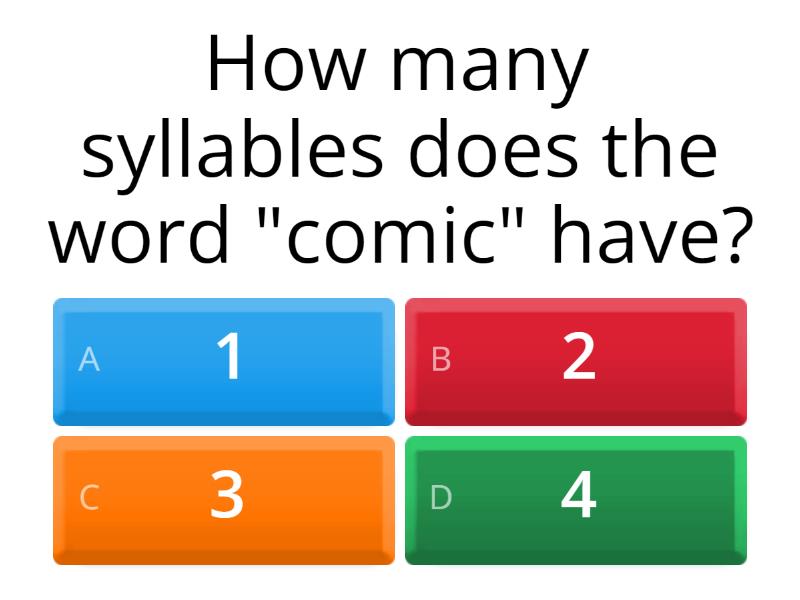 1) How many syllables does the word "comic" have? a) 1 b) 2 c) 3 d) 4 2) How many syllables does the word "content" have? a) 1 b) 2 c) 3 d) 4 3) How many syllables does the word "enlisted" have? a) 1 b) 2 c) 3 d) 4 4) How many syllables does the word "hottest" have? a) 1 b) 2 c) 3 d) 4 5) How many syllables does the word "indent" have? a) 1 b) 2 c) 3 d) 4 6) How many syllables does the word "product" have? a) 1 b) 2 c) 3 d) 4 7) How many syllables does the word "upset" have? a) 1 b) 2 c) 3 d) 4 8) How many vowels does the word "comic" have? a) 1 b) 2 c) 3 d) 4 9) How many vowels does the word "content" have? a) 1 b) 2 c) 3 d) 4 10) How many vowels does the word "enlisted" have? a) 1 b) 2 c) 3 d) 4 11) How many vowels does the word "hottest" have? a) 1 b) 2 c) 3 d) 4 12) How many vowels does the word "indent" have? a) 1 b) 2 c) 3 d) 4 13) How many vowels does the word "product" have? a) 1 b) 2 c) 3 d) 4 14) How many vowels does the word "upset" have? a) 1 b) 2 c) 3 d) 4