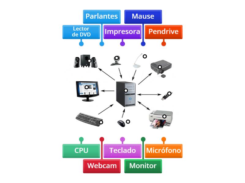 Parlantes, Webcam, Micrófono, Monitor, Teclado, Mause, CPU, Pendrive, Impresora, Lector de DVD.