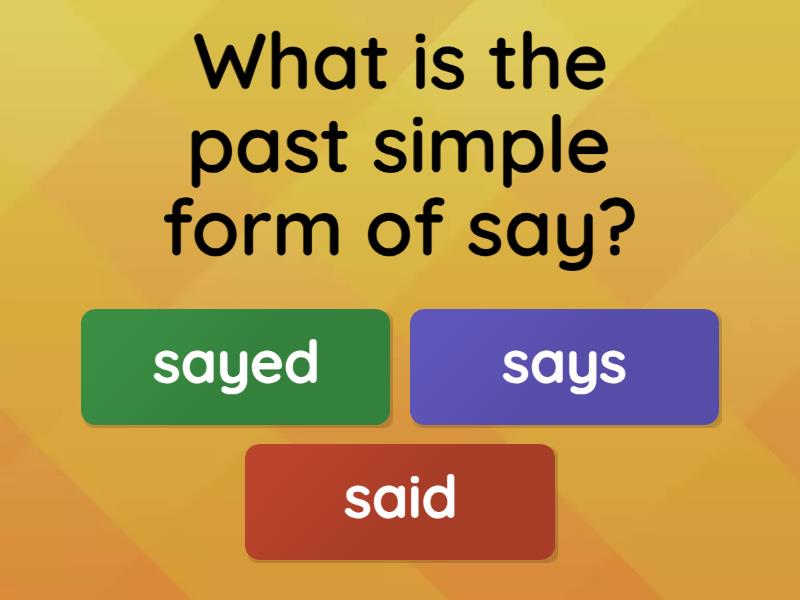 1) What is the past simple form of say? a) sayed b) says c) said 2) What is the past simple form of sleep? a) slept b) sleeped c) sleepy 3) What is the past simple form of tell? a) telled b) told c) tolled 4) What is the past simple form of think? a) thought b) thinked c) thinking 5) What is the past simple form of wake? a) waked b) woke c) wade 6) What is the past simple form of write? a) writ b) wrot c) wrote 7) What is the past simple form of wear? a) wore b) wored c) weared 8) What is the past simple form of win? a) wined b) won c) winned 9) What is the past simple form of teach? a) teached b) tort c) taught 10) What is the past simple form of sing? a) sang b) singed c) singer 11) What is the past simple form of take? a) taken b) taked c) took 12) What is the past simple form of understand? a) understood b) understanded c) understodded 13) What is the past simple form of give? a) gived b) gave c) gives 14) What is the past simple form of stand? a) standed b) stood c) stodd 15) What is the past simple form of show? a) showed b) shown c) showd 16) What is the past simple form of buy? a) buyied b) buyed c) bought 17) What is the past simple form of go? a) goes b) goed c) went 18) What is the past simple form of study? a) studied b) studyied c) studyed 19) What is the past simple form of break? a) breaked b) broken c) broke 20) What is the past simple form of give? a) given b) gived c) gave