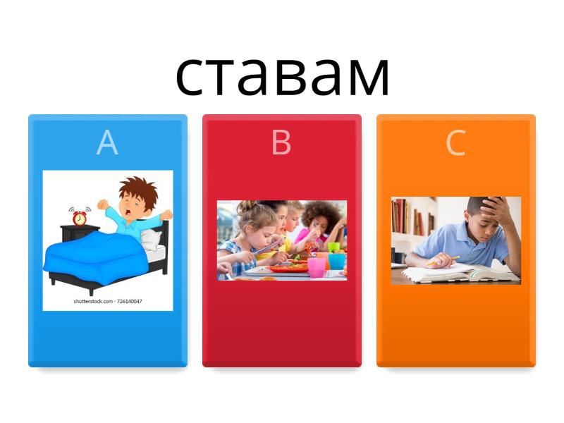 1) ставам a) b) c) 2) закусвам a) b) c) 3) ходя на училище a) b) c) 4) обядвам a) b) c) 5) прибирам се вкъщи a) b) c) 6) пиша домашни a) b) c) 7) вечерям a) b) c) 8) лягам си a) b) c)