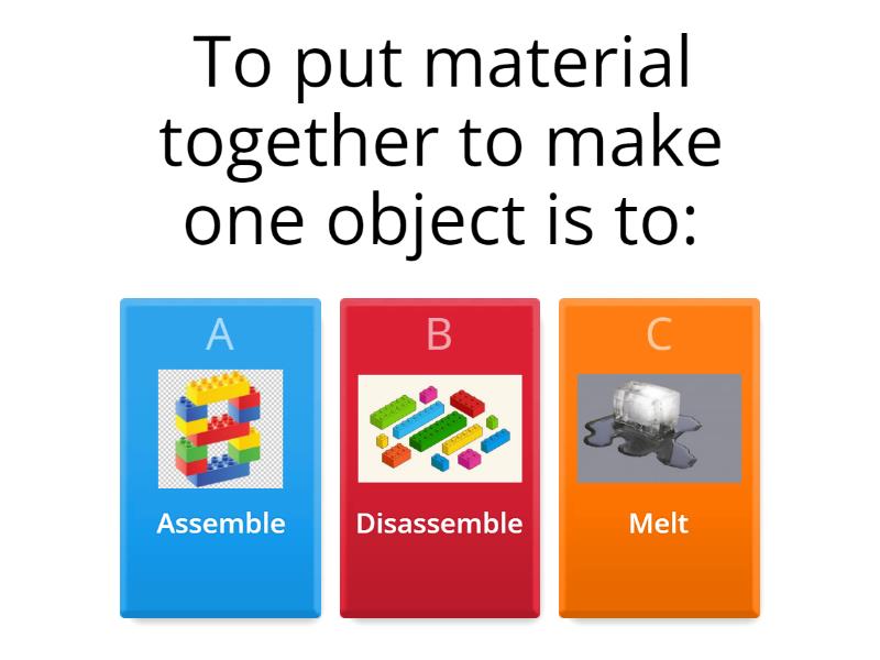 1) To put material together to make one object is to: a) Assemble b) Disassemble c) Melt 2) Which object has been disassembled? a) b) c) 3) Parts are put together to make one object: a) b) 4) When we build, do we assemble or disassemble? a) Assemble b) Disassemble