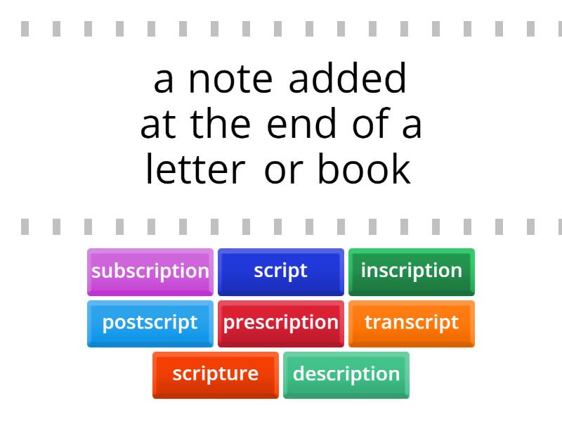 postscript - a note added at the end of a letter or book, prescription - a written direction for preparing or using medicine, transcript - a copy of a student’s school grades, inscription - words written on, or cut into, the surface of an object, subscription - an agreement to buy a product for a period of time, script - the written version of a play or a movie, description - a statement that tells how something looks or sounds, scripture - religious documents written and passed down over time,