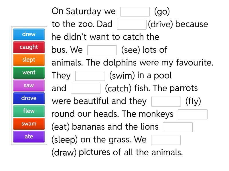 On Saturday we ____ (go) to the zoo. Dad ____(drive) because he didn’t want to catch the bus. We ____ (see) lots of animals. The dolphins were my favourite. They ____ (swim) in a pool and ____ (catch) fish. The parrots were beautiful and they ____ (fly) round our heads. The monkeys ____ (eat) bananas and the lions ____ (sleep) on the grass. We ____ (draw) pictures of all the animals.