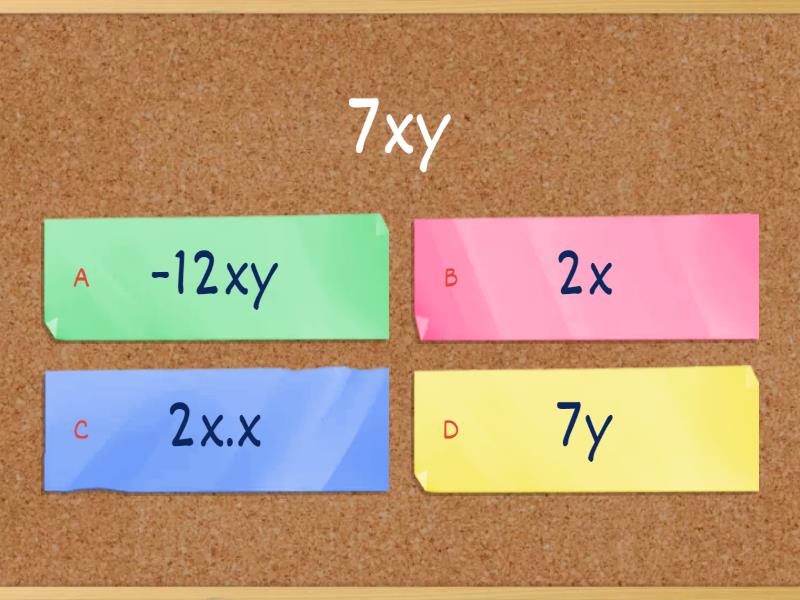 1) 7xy a) -12xy b) 2x c) 2x.x d) 7y 2) 1/2 a a) 13 x b) 2 a c) 1 ab d) 1/2 3) -2.5xyz a) 2.5 xy b) -1.5 xz c) -2.5zyx d) 2.5 yz 4) - xy a) -1 x b) - y c) yx d) -1 y 5) 5 abc a) 2 ab b) 5bc c) -abc d) abcd 6) 9mn a) m.m b) m.n.n c) 9.n.n d) 10 mn