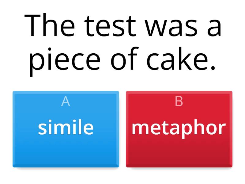 1) The test was a piece of cake. a) simile b) metaphor 2) Layan's teacher was a monster. a) simile b) metaphor 3) Hamad's brother is as quiet as a mouse. a) simile b) metaphor 4) The water in Tameem and Zeyad's pool was as clear as crystal. a) simile b) metaphor 5) Shafina has a heart of gold. a) simile b) metaphor 6) Abdulla's eyes were sparkling like diamonds. a) simile b) metaphor 7) My dad was being a grumpy bear. a) simile b) metaphor 8) Joumana is a superstar! a) simile b) metaphor 9) Mohammad runs like lightning. a) simile b) metaphor 10) Elsiddig's hands were as cold as ice. a) simile b) metaphor
