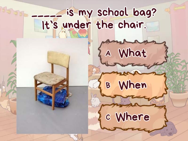 1) _____ is my school bag? It`s under the chair. a) What b) When c) Where 2) _____ do you do at night? I sleep. a) What b) When c) Where 3) _____ are their names? They are Nancy and Mark. a) What b) When c) Where 4) _____ have we got English lesson? We`ve got it on Tuesday. a) What b) When c) Where 5) _____ do you have dinner? I have dinner at 7:30 in the evening. a) What b) When c) Where 6) _____ is your cousin? He is at school. a) What b) When c) Where