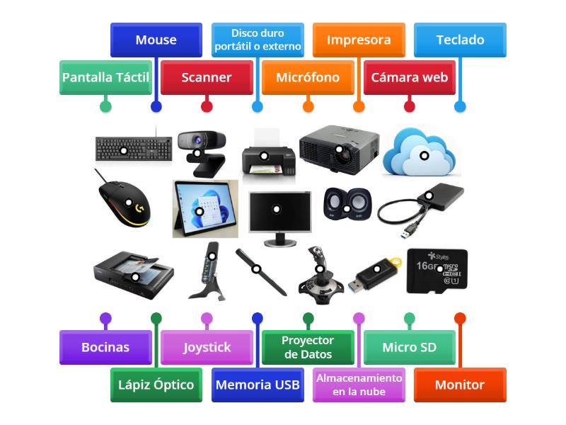 Teclado, Cámara web, Impresora, Proyector de Datos, Almacenamiento en la nube, Mouse, Pantalla Táctil , Monitor, Bocinas, Disco duro portátil o externo, Scanner, Micrófono, Lápiz Óptico, Joystick, Memoria USB, Micro SD.