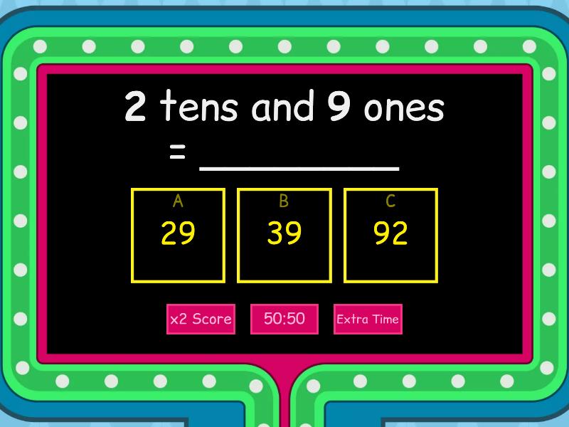 1) 2 tens  and  9 ones = ________ a) 29 b) 39 c) 92 2) 5 tens and 3 ones = ________ a) 41 b) 23 c) 53 3) 1 tens and 7 ones = ________ a) 13 b) 17 c) 23 4) 1 tens and 0 ones = ________ a) 10 b) 72 c) 01 5) 4 tens and 5 ones = ________ a) 43 b) 61 c) 45