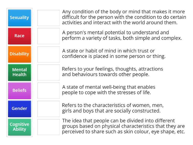 Race  - The idea that people can be divided into different groups based on physical characteristics that they are perceived to share such as skin colour, eye shape, etc., Beliefs - A state or habit of mind in which trust or confidence is placed in some person or thing., Gender - Refers to the characteristics of women, men, girls and boys that are socially constructed., Disability  - Any condition of the body or mind that makes it more difficult for the person with the condition to do certain activities and interact with the world around them., Cognitive Ability - A person's mental potential to understand and perform a variety of tasks, both simple and complex., Mental Health - A state of mental well-being that enables people to cope with the stresses of life., Sexuality - Refers to your feelings, thoughts, attractions and behaviours towards other people.,