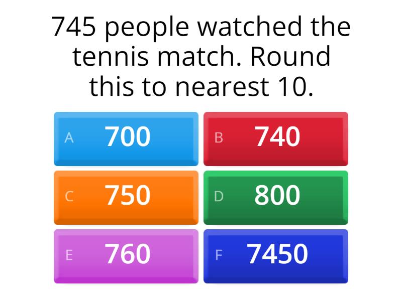 1) 745 people watched the tennis match. Round this to nearest 10. a) 700 b) 740 c) 750 d) 800 e) 760 f) 7450 2) 8869 students use the public transport. Round this to nearest 1000. a) 8860 b) 8800 c) 8600 d) 8000 e) 8900 f) 9000 3) 44,541 people watched football match. Round this to nearest 100. a) 44,600 b) 45,000 c) 46,000 d) 44,500 e) 44,700 f) 44,000 4) Alice spent £23.56 on grocery shopping. Round this to nearest whole pounds. a) £24 b) £23.60 c) £23 d) £20 e) £30 f) £23.50 5) Jess works out answer to 125.66 + 196.28 on a calculator. Her answer on the calculator is 321.94. Round her answer to the nearest tenth. a) 321.10 b) 321.95 c) 321.0 d) 322.0 e) 321.9 f) 322.9 6) Write 84.07765 correct to the nearest hundredth.  a) 84.08 b) 800 c) 900 d) 80 e) 90 f) 84.07