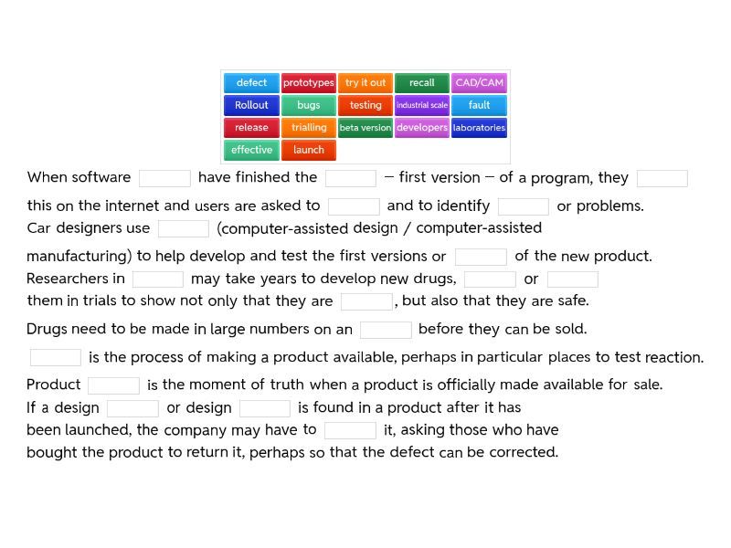When software ____ have finished the ____ – first version – of a program, they ____ this on the internet and users are asked to ____ and to identify ____ or problems. Car designers use ____ (computer-assisted design / computer-assisted manufacturing) to help develop and test the first versions or ____ of the new product. Researchers in ____ may take years to develop new drugs, ____ or ____ them in trials to show not only that they are ____, but also that they are safe. Drugs need to be made in large numbers on an ____ before they can be sold. ____ is the process of making a product available, perhaps in particular places to test reaction. Product ____ is the moment of truth when a product is officially made available for sale. If a design ____ or design ____ is found in a product after it has been launched, the company may have to ____ it, asking those who have bought the product to return it, perhaps so that the defect can be corrected.
