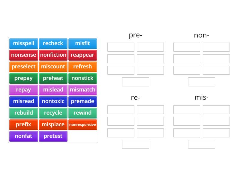 pre-: prefix, prepay, premade, preheat, pretest, preselect, non-: nonfat, nonstick, nonsense, nonfiction, nontoxic, nonresponsive, re-: rebuild, recheck, reappear, rewind, recycle, repay, refresh, mis-: misspell, misplace, miscount, misread, misfit, mislead, mismatch,