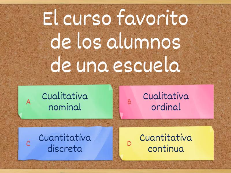 1) El curso favorito de los alumnos de una escuela a) Cualitativa nominal b) Cualitativa ordinal c) Cuantitativa discreta d) Cuantitativa continua 2) Cantidad de clientes atendidos en un restaurante en un día. a) Cualitativa nominal b) Cualitativa ordinal c) Cuantitativa discreta d) Cuantitativa continua 3) Lugar que ocupa un nadador en una competencia. a) Cualitativa nominal b) Cualitativa ordinal c) Cuantitativa discreta d) Cuantitativa continua 4) Número de pétalos que tiene una flor. a) Cualitativa nominal b) Cualitativa ordinal c) Cuantitativa discreta d) Cuantitativa continua 5) Color de cabello de los niños que audicionan para una película de Netflix. a) Cualitativa nominal b) Cualitativa ordinal c) Cuantitativa discreta d) Cuantitativa continua 6) Tiempo requerido para responder las llamadas en un call center. a) Cualitativa nominal b) Cualitativa ordinal c) Cuantitativa discreta d) Cuantitativa continua 7) Candidato al cuál apoyan los votantes en las elecciones presidenciales de Perú. a) Cualitativa nominal b) Cualitativa ordinal c) Cuantitativa discreta d) Cuantitativa continua 8) Número de páginas de una serie de libros de estadística. a) Cualitativa nominal b) Cualitativa ordinal c) Cuantitativa discreta d) Cuantitativa continua 9) Tiempo de vuelo de los aviones que van de Lima a Santiago. a) Cualitativa nominal b) Cualitativa ordinal c) Cuantitativa discreta d) Cuantitativa continua 10) Número de presidentes que ha tenido tu país en los últimos 5 años. a) Cualitativa nominal b) Cualitativa ordinal c) Cuantitativa discreta d) Cuantitativa continua 11) Resultado de tirar dos dados. a) Cualitativa nominal b) Cualitativa ordinal c) Cuantitativa discreta d) Cuantitativa continua 12) Se define una variable como la fracción de focos defectuosos en una inspección de 100 focos escogidos aleatoriamente en el almacén de una fábrica. ¿Qué tipo de variable es? a) Cualitativa nominal b) Cualitativa ordinal c) Cuantitativa discreta d) Cuantitativa continua 13) El DNI de una persona a) Cualitativa nominal b) Cualitativa ordinal c) Cuantitativa discreta d) Cuantitativa continua 14) Mes de nacimiento de los estudiantes de primer año de secundaria a) Cualitativa nominal b) Cualitativa ordinal c) Cuantitativa discreta d) Cuantitativa continua