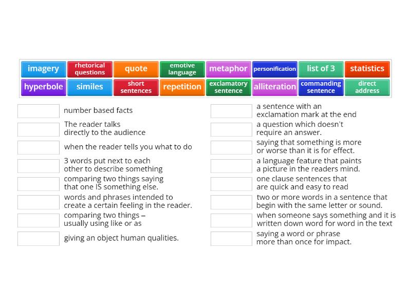 alliteration - two or more words in a sentence that begin with the same letter or sound., metaphor - comparing two things saying that one IS something else., personification - giving an object human qualities., imagery - a language feature that paints a picture in the readers mind., rhetorical questions - a question which doesn’t require an answer., repetition - saying a word or phrase more than once for impact., hyperbole - saying that something is more or worse than it is for effect., emotive language - words and phrases intended to create a certain feeling in the reader., similes - comparing two things – usually using like or as, direct address - The reader talks directly to the audience, quote - when someone says something and it is written down word for word in the text, commanding sentence - when the reader tells you what to do, statistics - number based facts, list of 3 - 3 words put next to each other to describe something, short sentences - one clause sentences that are quick and easy to read , exclamatory sentence - a sentence with an exclamation mark at the end,