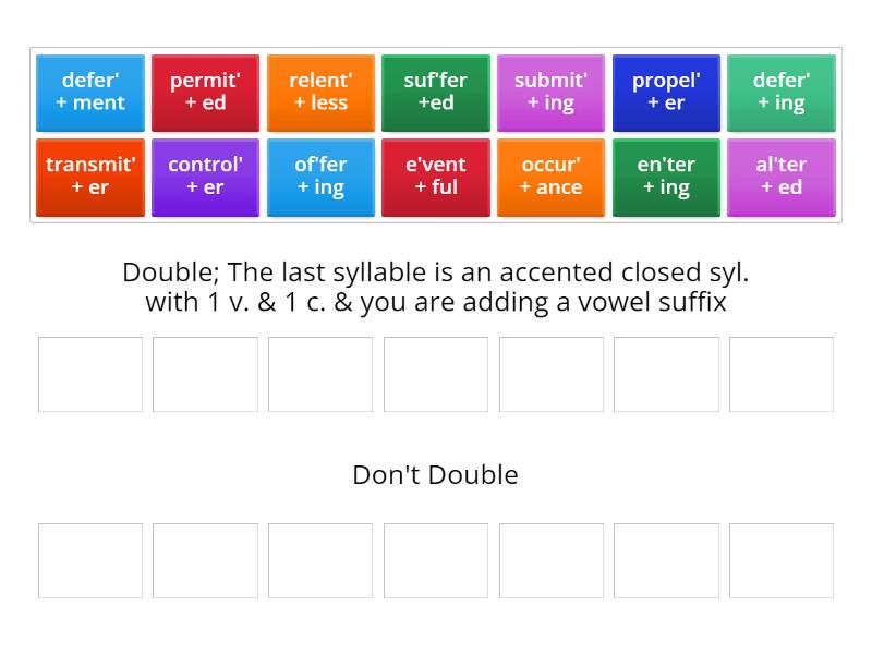 Double; The last syllable is an accented closed syl. with 1 v. & 1 c. & you are adding a vowel suffix: propel' + er, defer' + ing, submit' + ing, control' + er, transmit' + er, occur' + ance, permit' + ed, Don't Double: e'vent + ful, defer' + ment, al'ter + ed, en'ter + ing, relent' + less, of'fer + ing, suf'fer +ed,
