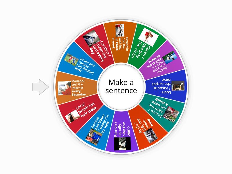 1) Simon and Tommy/ play football now 2) Carolina / make the bed every day 3) Benjamin / do the washing up twice a week 4) Karen / like play the violin 5) Santino / take the dog for a walk at the moment 6) Lucía / vacuum the carpet now 7) Franco / wash the car once a week 8) Rocio / tidy her room now 9) Ramon / usually play the piano 10) Romina and Mateo / empty the bin now 11) Lara/ brush her hair now 12) Mariana/ surf the internet every Saturday