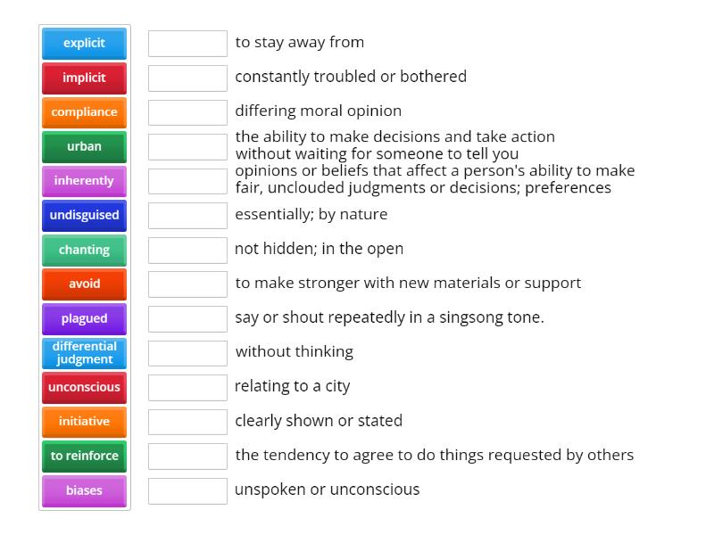 implicit - unspoken or unconscious, explicit - clearly shown or stated, undisguised - not hidden; in the open, unconscious - without thinking, urban - relating to a city, differential judgment - differing moral opinion, compliance - the tendency to agree to do things requested by others, biases - opinions or beliefs that affect a person's ability to make fair, unclouded judgments or decisions; preferences, initiative - the ability to make decisions and take action without waiting for someone to tell you, avoid - to stay away from, plagued - constantly troubled or bothered, inherently - essentially; by nature, chanting - say or shout repeatedly in a singsong tone., to reinforce - to make stronger with new materials or support,